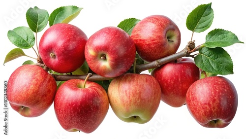 A branch of ripe red apples with green leaves isolated on white background showing juicy texture and vibrant color