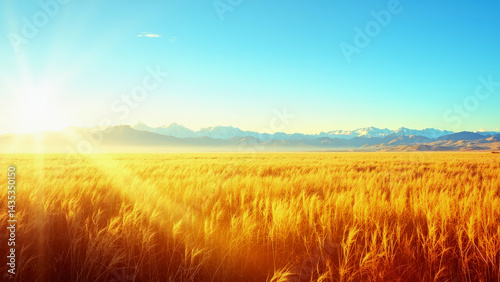 A breathtaking vista of a vast field of golden wheat bathed in the warm glow of the sun, creating a serene and tranquil atmosphere