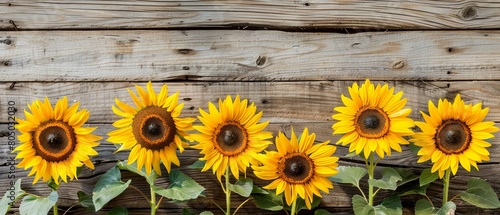 A Bright sunflowers arranged in a row on a rustic wooden plank background