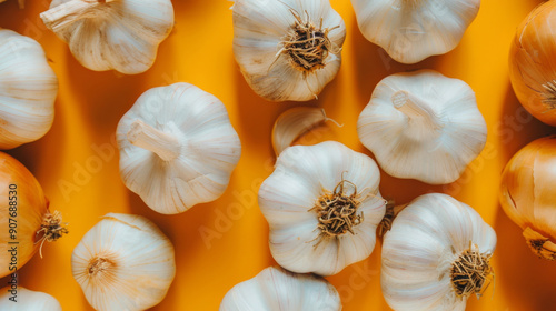A bunch of garlic and onions are on a yellow background