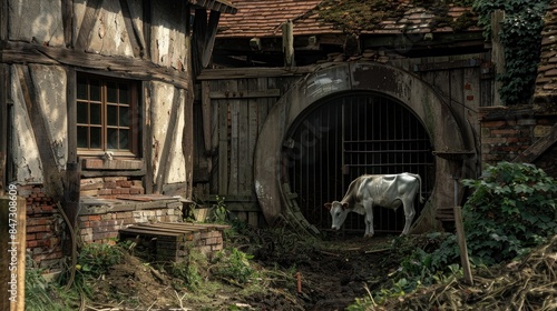 A calf is located in the circular stable in front of the building