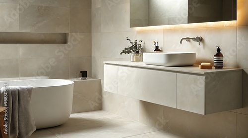A calm and minimalist bathroom with light gray tiles, soft natural lighting, and a floating vanity with a white sink. The soft textures and clean lines create a peaceful atmosphere,