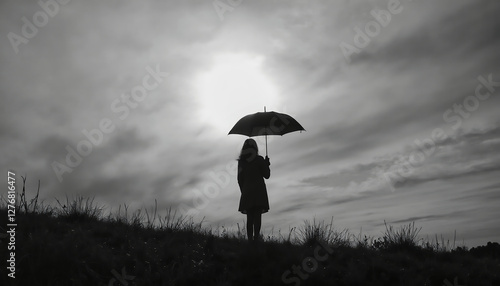 A captivating silhouette of a woman holding an umbrella against a dramatic cloudy sky, evoking feelings of solitude and reflection in a breathtaking landscape.