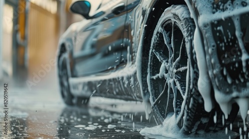 A car being manually washed with soap and high-pressure water.