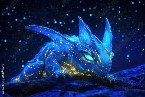 blue, creature, fantasy, glowing, light, dark, star, space, cosmic, celestial, mythical, art, design, illustration, detail, texture, scale, fur, pattern, peaceful, serene, energy, mysterious, magic, beauty, fantastic, imagination, concept, visual, composition, pose, eye, claw, horn, animal, digital, shimmering, luminescent, surface, depth, nocturnal, resting, elegant, enchanting, high-coloured, gold, sapphire