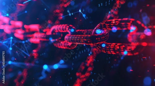 A chain of red and blue links is shown in a blurry image. The chain is made up of many small links, and the colors are vibrant and eye-catching. The image has a futuristic and technological feel