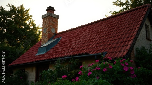 roof, brick, house, dormer, window, foliage, flower, pink, green, summer, sunset, evening, sky, architecture, building, home, residential, landscape, exterior, natural, beauty