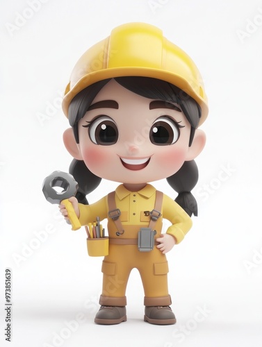character, cartoon, construction, men at work, tool, wrench, helmet, smile, outfit, yellow, playful, design, creativity, profession, industry, cute, happy, female, illustration, art, fun, job, engineer, attire, skill, animation, friendly, casual attire, young, vibrant, cheerful, skilled, confident, pose, equipment, safety, imaginative, creative, role, builder, teamwork, environment