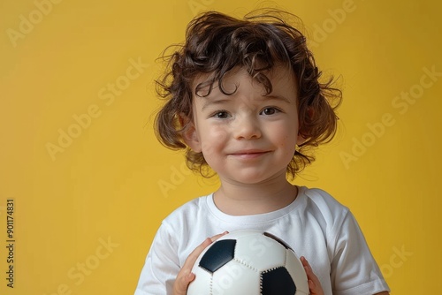 A cheerful child with curly hair holding a soccer ball, standing against a bright yellow background.
