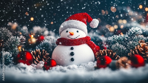 A cheerful snowman adorned with a scarf and hat, standing proudly amidst a blanket of glistening snow, evoking a joyful winter spirit.