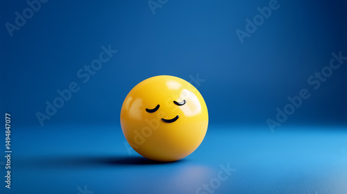 A cheerful yellow emoji ball with a soft smile and closed eyes, peacefully resting on a blue background, perfect for illustrating themes of sleep, relaxation, and happiness