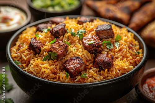 A Cinematic Biryani Experience with Juicy Meat and Side Dishes