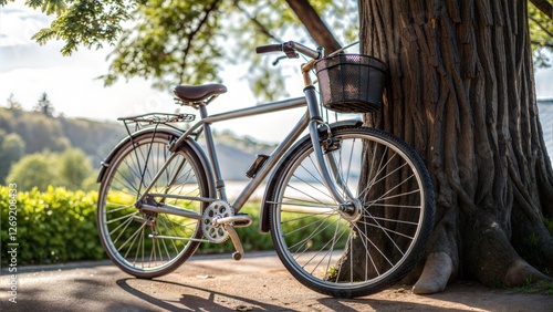 A classic silver bicycle resting against a tree, surrounded by vibrant greenery in soft sunlight.