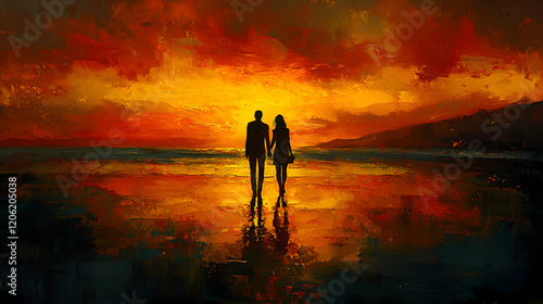 A classic Valentine scene with a couple walking hand in hand along a beach at sunset, styled in a romantic impressionistic style with painterly textures and warm golden hues,