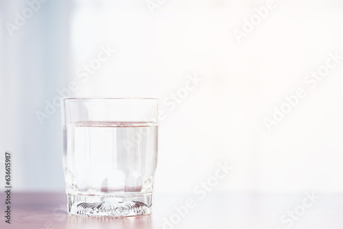 A clear glass containing water is placed upon a wooden table with soft orange sunlight from outside for the concept of healthy water consumption.