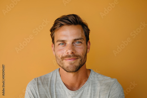 A close up portrait of a young man with a subtle smile