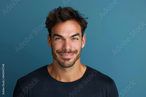 A close up portrait of a young man with a subtle smile