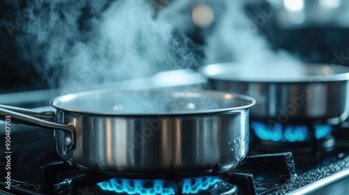stainless, steel, boiling, pot, blue, flames, gas, stove, steam, cooking, kitchen, culinary, heat, bubble, utensil, metallic, appliance, home, energy, preparing, food, domestic, essential, modern, efficiency, flames, practical, cookware, everyday, utility, indoor, focusing, activity, sensation, lifestyle, convenience, style