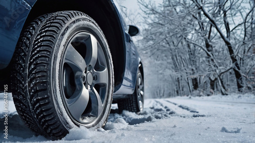 A close-up of a car tire driving through deep snow in a winter landscape. The car is covered with a light layer of snow and frost, emphasizing the cold conditions