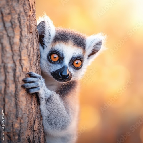 A close-up of a curious lemur peeking around a tree trunk, set against a warm, blurred background, This image can be used in wildlife articles, educational materials, or animal conservation campaigns