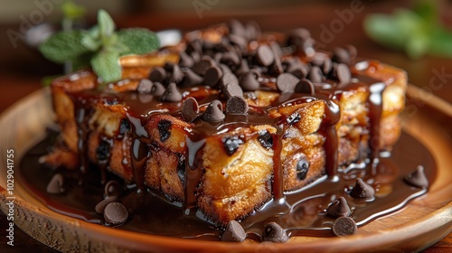 A close-up of a delicious chocolate dessert with chocolate chips and chocolate sauce.