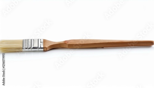 A close-up of a paintbrush with natural bristles and a wooden handle against a white background.