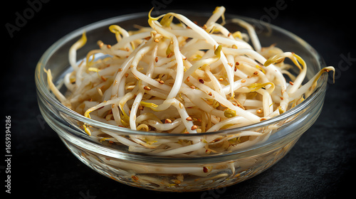 A close-up of fresh bean sprouts in a glass bowl, perfect for adding crunch to salads and stir-fry dishes.