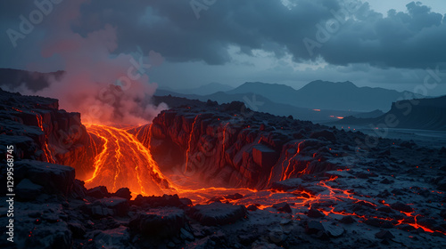 A close-up of lava pouring from a s crater with a dark sky and room for text.