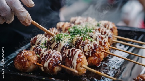 A close-up of takoyaki being served with wooden skewers, showcasing the crispy outer layer and gooey, octopus-filled interior