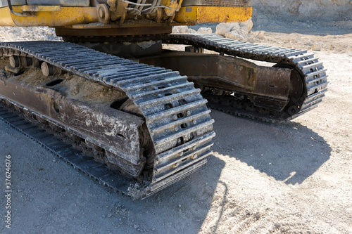 A close-up of the tracks of a heavy large excavator in a mining quarry.
