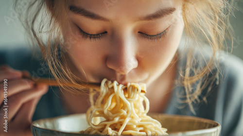 A close-up shot of person eating bowl of noodles with chopsticks. The image captures the simple pleasure and sensory experience of enjoying warm, delicious meal, highlighting comfort and satisfaction