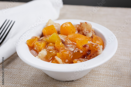 A closeup view of a bowl of peach cobbler, in a restaurant or kitchen setting.