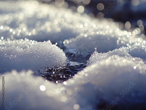 A close-up view of winter snow melting, with water droplets forming small streams.