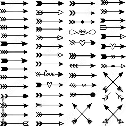 A collection of decorative black arrow designs featuring various shapes, patterns, hearts, and symmetrical arrangements.