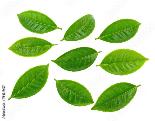 A collection of green leaves on a black background. Each leaf is detailed and isolated
