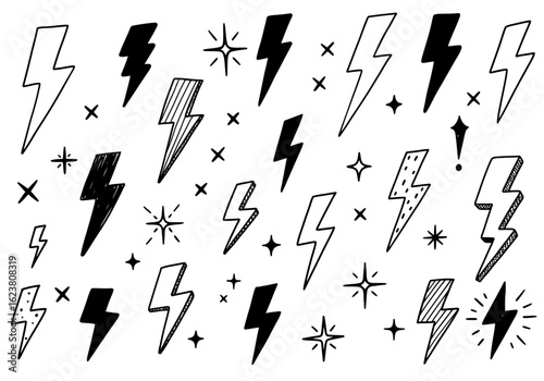 A Collection of Hand-Drawn Lightning Bolt Illustrations with Sparkle Accents Great for Design Projects and Creative Expression