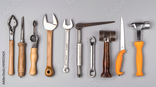 A collection of woodworking tools, including hammers, screwdrivers, and scissors