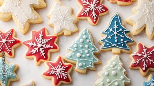 A colorful assortment of holiday cookies featuring Christmas trees, snowflakes, and stars with intricate icing, on white