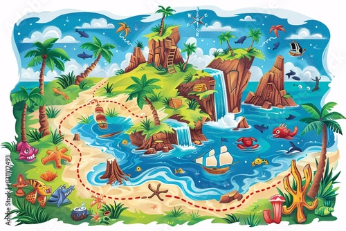 colourful, cartoon, treasure, map, island, sandy, beach, palm, tree, hidden, lagoon, waterfall, red, dotted, line, leading, big, x, surrounded, playful, sea, creature, decoration