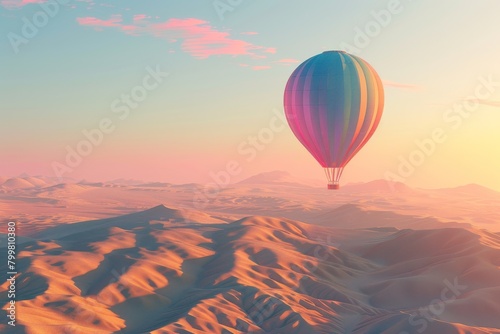 A colorful hot air balloon is floating over a desert landscape