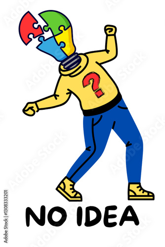 A colorful puzzle-lamp-headed figure with a question mark on its shirt, symbolizing confusion or lack of ideas, perfect for creative or problem-solving concepts.Transparent background for easy editing