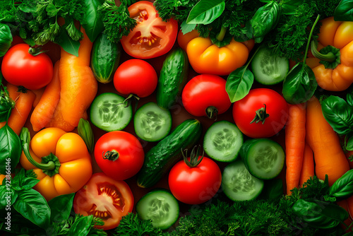 a colorful vegetable background featuring an assortment of fresh tomatoes, bell peppers, cucumbers, and carrots, interspersed with lush green parsley and basil leaves