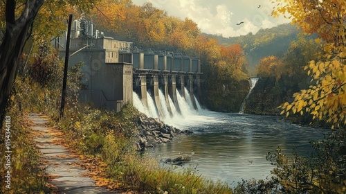 water, river, fall, autumn, foliage, leaf, dam, concrete, cascade, flow, path, pathway, nature, scenic, landscape, tree, forest, wood, sky, cloud, sunlight, green, yellow, orange, red, brown, season, change, environment, energy, power, hydro, electricity, industrial, construction, rural, wilderness, travel, journey, peaceful, tranquil, serenity, beauty, majestic, vibrant, bright, picturesque