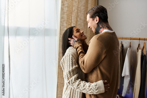 A couple embraces joyfully at home, celebrating the beauty of their love during Christmas.