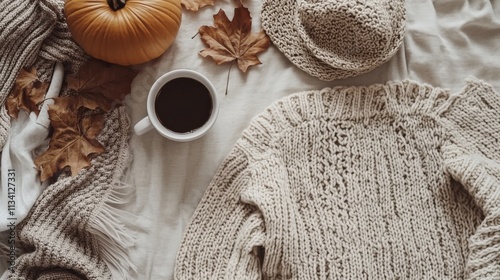A cozy autumn flat lay with coffee, a knitted sweater, autumn leaves, a pumpkin, and a hat, representing fall comfort