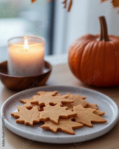 A cozy autumn scene featuring leaf-shaped cookies, a candle, and a pumpkin.