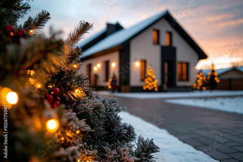 A cozy home at dusk is lit with golden Christmas lights, creating a warm, festive atmosphere as snow reflects the soft winter glow, symbolizing holiday joy. Concept: "preparation festive winter glow."