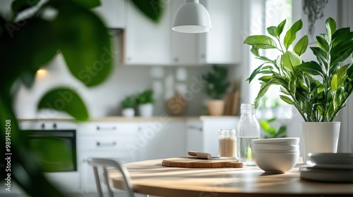 cosy, kitchen, table, fresh, green, plant, bowl, wooden, round, inviting, atmosphere, home, dining, cooking, welcoming, warm, modern, chic, stylish, interior, design, clean, refresh, bright, natural, daylight, elegant, serenity, comfort, space, living, comfortable, freshness, nature, organic, arrangement, everyday, life, home decor, vibrant