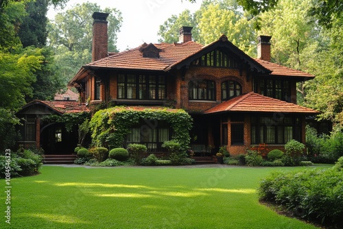 A cozy wooden house surrounded by lush greenery on a cloudy day in a tranquil setting