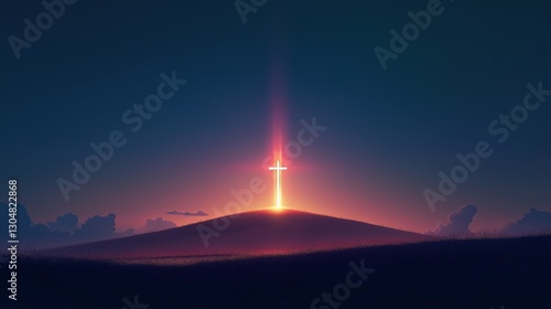 cross, atop, hill, light, shining, down, hope, spiritual, connection, during, easter, season, panoramic, view, empty, field, dusk, illuminated, creating, silhouette, effect, simple, jesus christ, sacrifice, christian, art, background, gradient, sky, dark, blue, adding, depth, contrast, scene